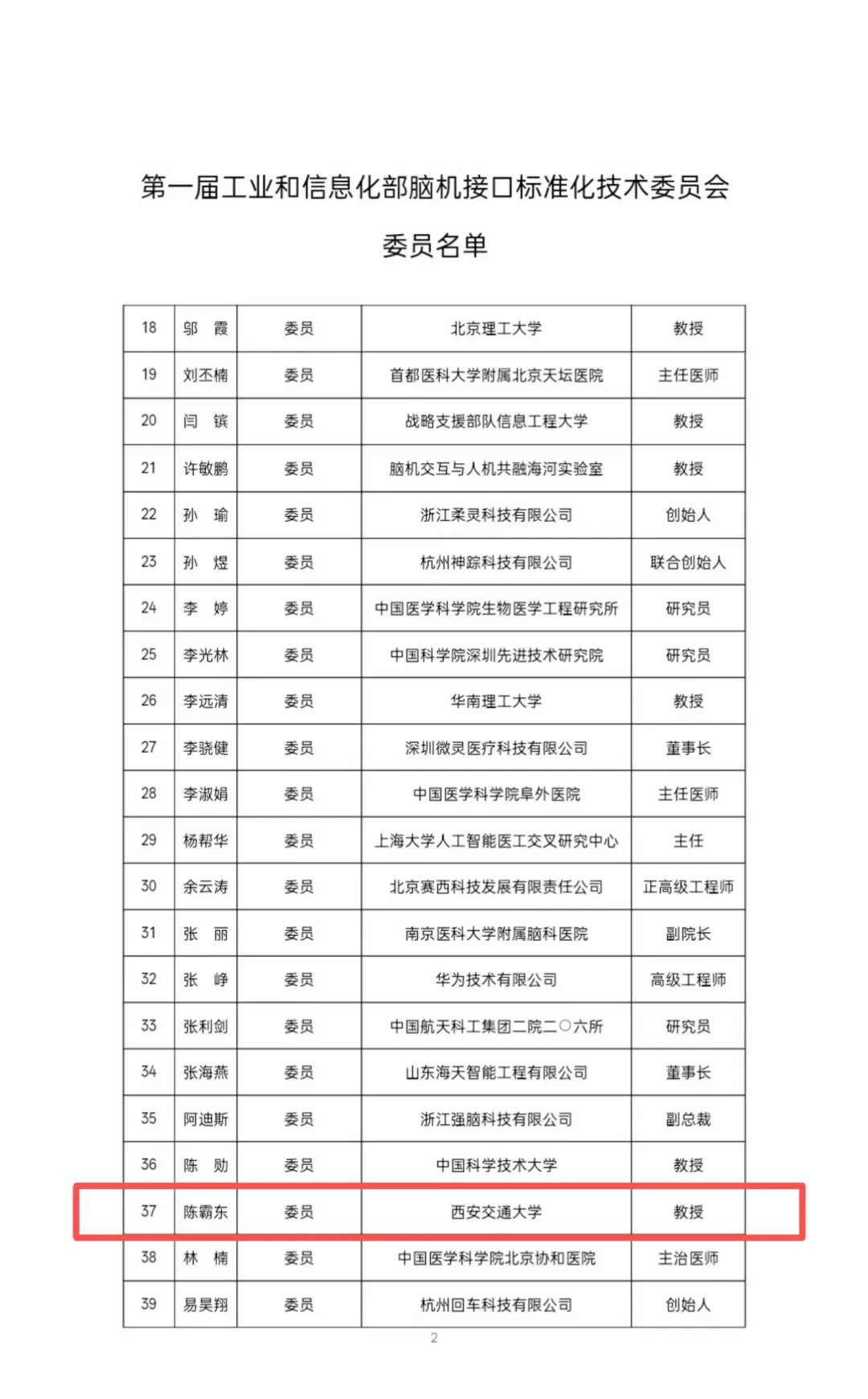 2024年10月25日,工业和信息化部脑机接口标准化技术委员会首届委员名单完成公示,深圳脑机星链科技有限公司联合创始人陈霸东教授当选第一届工业和信息化部脑机接口标准化技术委员会专家委员。