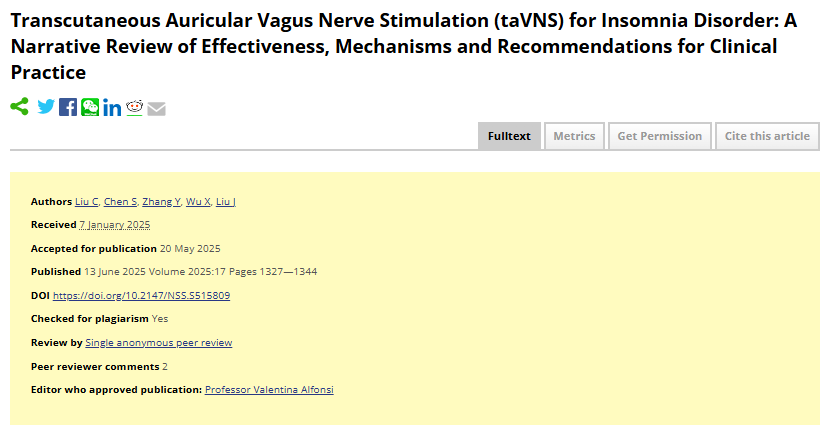 近日,发表于国际知名期刊 《Nature and Science of Sleep》 的一项研究,为我们带来了一个令人振奋的答案:经皮耳迷走神经刺激(taVNS)。这种疗法就像在耳朵上贴一个“睡眠贴片”,通过温和刺激便能精准作用于负责放松的神经,从而安全、有效地改善睡眠。它为何能成为非药物疗法的新星?背后的科学原理是什么?让我们一起来了解这个可能改变千万人睡眠的新希望!