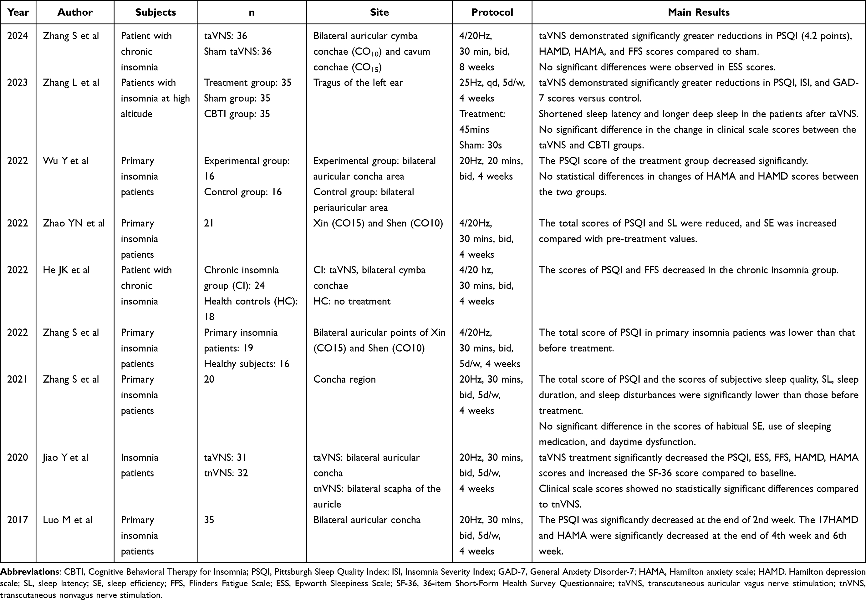 临床观察显示,taVNS在改善癫痫、抑郁患者睡眠质量的同时,也对原发性失眠具有治疗潜力。多项研究表明,taVNS能降低匹兹堡睡眠质量指数(PSQI)、汉密尔顿抑郁量表(HAMD)及汉密尔顿焦虑量表(HAMA)评分,提升睡眠效率与深睡眠(N3期)比例,缩短入睡潜伏期(SOL)。近期一项为期8周的随机对照试验(RCT)进一步证实taVNS可带来持续疗效。(表1)