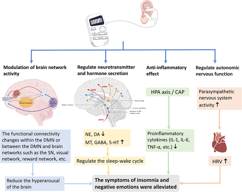 taVNS治疗失眠涉及多系统调节,其可能机制如下: