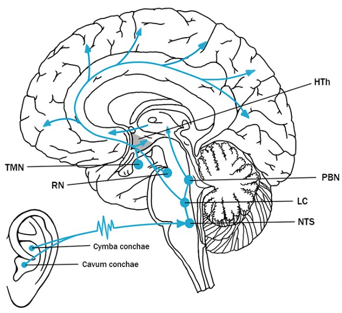 迷走神经是包含大量传入纤维的主要副交感神经,负责大脑与器官间的双向信息传递。耳廓是迷走神经在体表的唯一分布区,其耳支(ABVN)密集支配耳甲区等区域。(图1)这使得通过刺激耳部即可直接激活迷走神经传入通路。刺激信号首先传入至孤束核(NTS),进而影响脑干(如蓝斑、缝核)、下丘脑及皮层等广泛脑区,调节自主神经与中枢神经功能。此解剖基础构成了“耳迷走神经传入通路(AVAP)”理论,也是耳部迷走神经刺激(taVNS)的应用依据。
